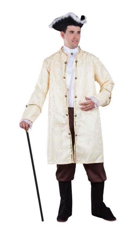 Incluye levita color beig damascada, chorrera cuello, sombrero y pantalones con cubrebotas.